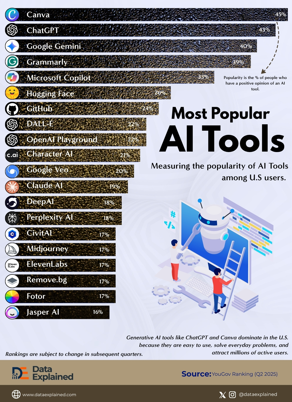 In the long list of AI tools used in the United States, Canva has topped the list as the most popular so far in 2025, both generally and in the Generative AI category.