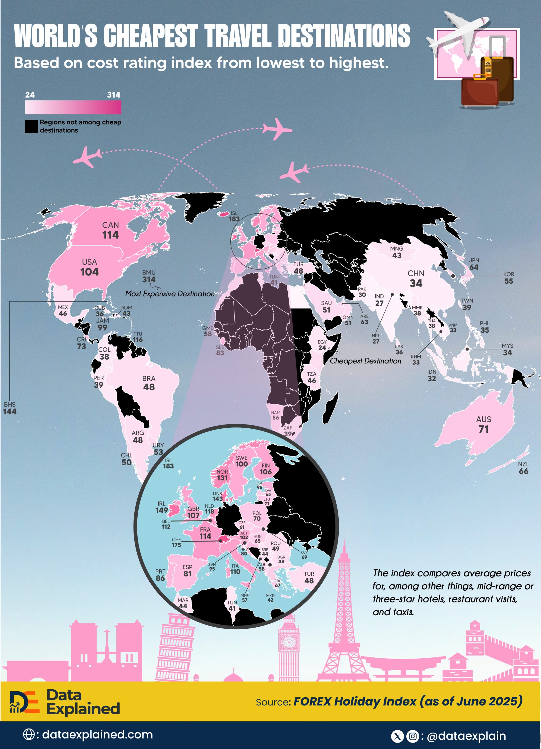 One fascinating insight is that there are attractive European destinations, as well as several Asian and African countries, where it is really cheap to visit.