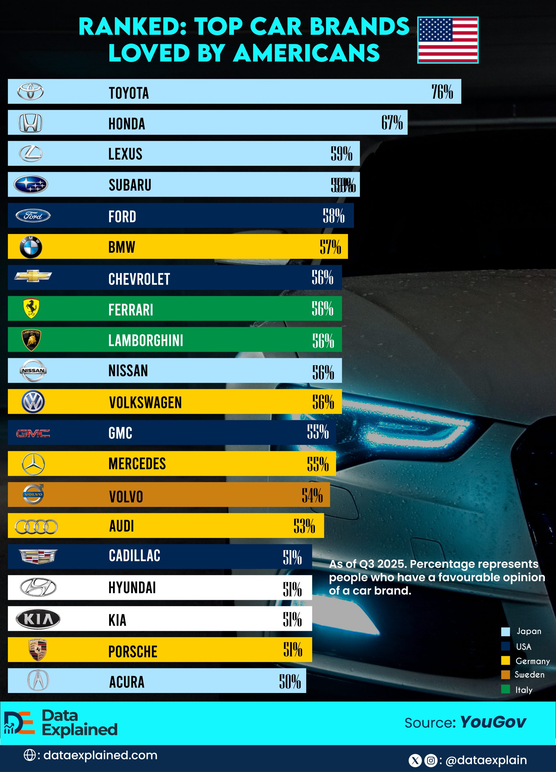 - Japanese car brands occupy 9 of the top 50 most-loved brands among Americans.