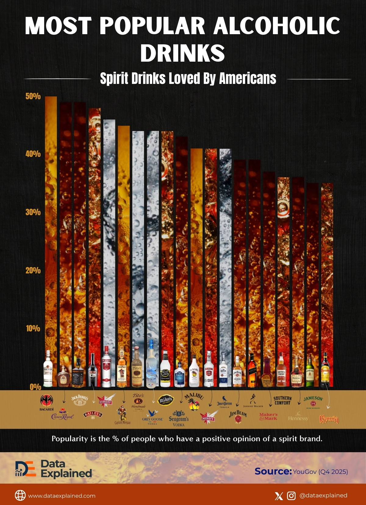 - Spirits dominate, with Bacardi (50%), Crown Royal, and Jack Daniel’s (49% each) topping the ranks in popularity.