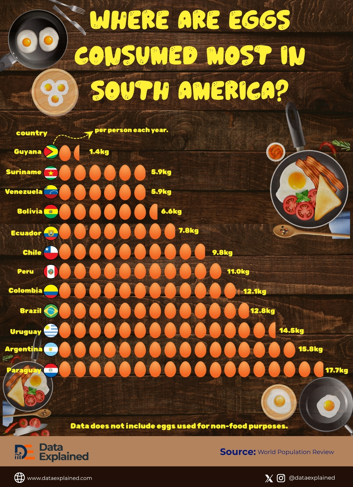 - Paraguay is South America’s top consumer, with an annual egg consumption of 17.7 kg per person.
