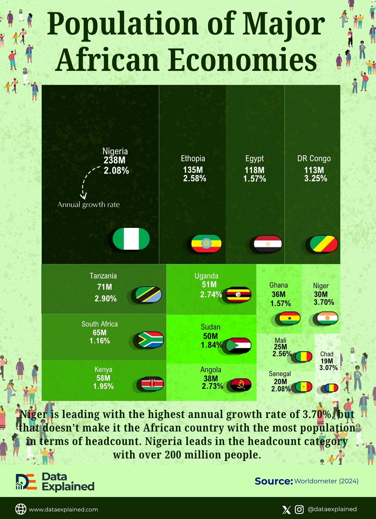 Niger leads with the highest annual growth rate of 3.70%, but that doesn’t make it the African country with the largest population by headcount.